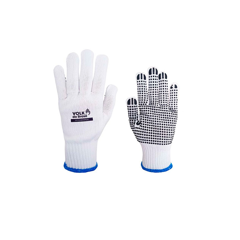 Luva de segurança confeccionada em fibras sintéticas, 10 gauge, pigmentos em PVC (policloreto de vinila) na face palmar, punho com inserção de fibras elásticas e acabamento em fibras sintéticas.