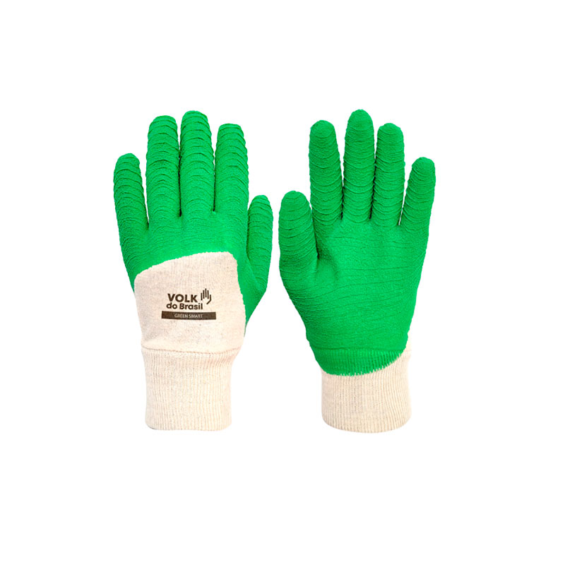 Luva de segurança confeccionada em fibras sintéticas (poliéster) tipo “interlock”, revestimento em látex corrugado na palma, dedos e dorso dos dedos, com punho de malha costurado