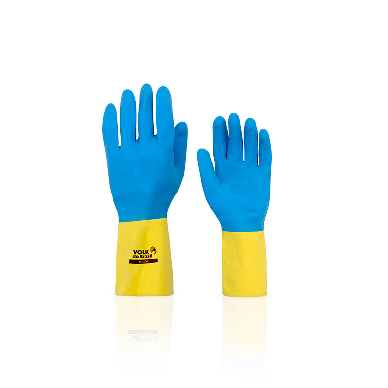Luva de segurança confeccionada em látex natural e revestimento na face palmar, ponta dos dedos e dorso em neoprene, acabamento antiderrapante na face palmar e ponta dos dedos, revestimento interno em flocos de algodão.