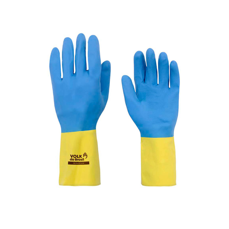 Luva de segurança confeccionada em látex natural e revestimento na face palmar, ponta dos dedos e dorso em neoprene, acabamento antiderrapante na face palmar e ponta dos dedos, revestimento interno em flocos de algodão.