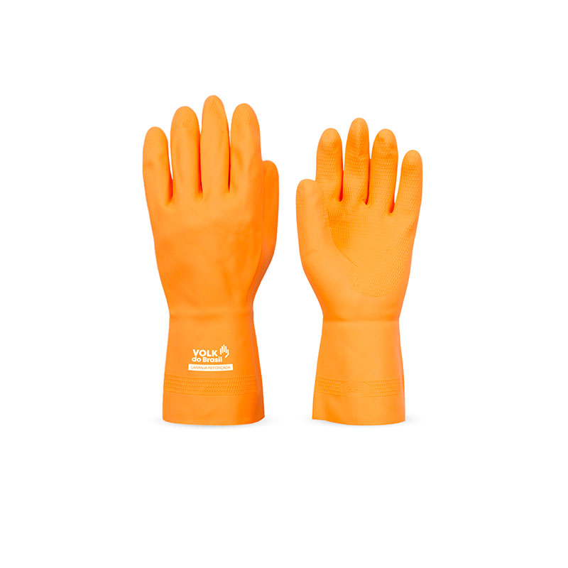 Luva de segurança confeccionada em látex natural, revestimento interno em flocos de algodão, relevo antiderrapante na face palmar e face palmar dos dedos.